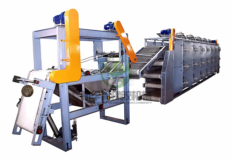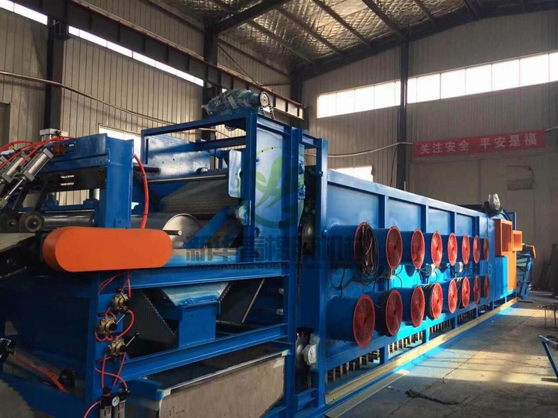 平铺式胶片冷却线主要适用于密炼机混炼、塑炼经开炼机压片或双螺杆挤出压片后的胶片冷却、叠片、收片。该线主要由主机、电控系统两大部分组成:主机含进料衔接段、粉水池段、冷却段及裁切段,电控系统整线采用PLC统一控制,可以实现无人操作,自动化程度高。